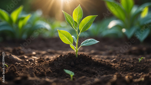 World environment day, A vibrant green seedling with multiple leaves growing in rich, dark soil, illuminated by warm sunlight in a blurred background