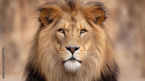 World Lion Concept. Majestic lion portrait with detailed fur and intense gaze.