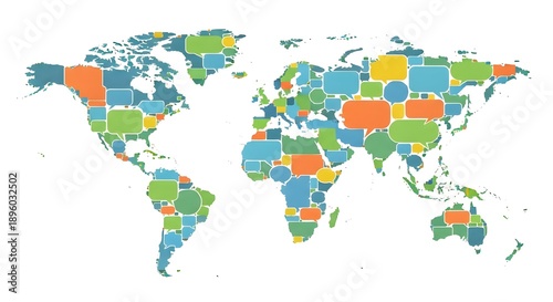 World Map Composed of Colorful Speech Bubbles Representing Global Communication and Languages