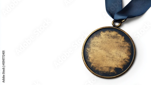 Worn gold medal with a blue ribbon on a white background