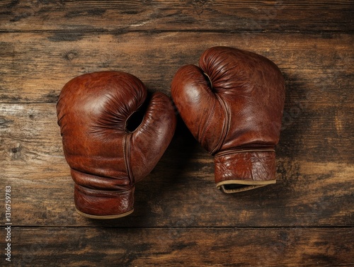 Worn leather boxing gloves resting on a vintage textured wooden surface