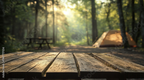 Worn wooden table in foreground with sunlight filtering through forest campsite featuring tent and picnic table, creating peaceful and natural outdoor atmosphere