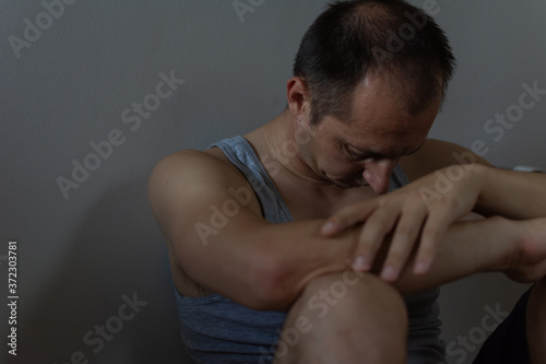 Worried man sitting on floor with hand on knees in bedroom in serious mood emotion. Physical healthcare and social issue.