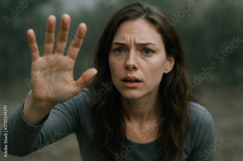 Worried woman pressing hand against glass, seeking help and showing fear and desperation in her eyes