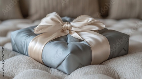 Wrapped Gift Box with Beige Ribbon on Tufted Bedding in Soft Natural Light