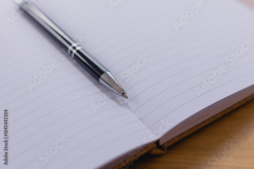 Writing and planning concept with a close-up of a pen resting on an open lined notebook, symbolizing creativity, note-taking, education, organization and preparation for personal or professional tasks