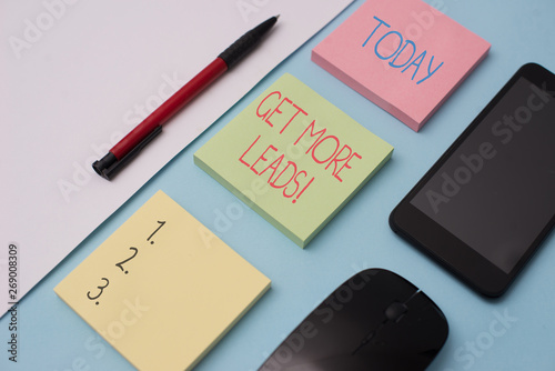 Writing note showing Get More Leads. Business concept for initiation consumer interest or enquiry products or services Note papers and stationary plus gadgets placed sideways above backdrop