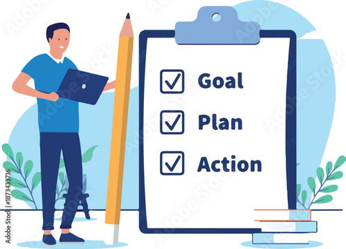 Writing strategy - Man person standing with pencil writing checklist and checkbox with goals, plan, and action for business or development project. Flat design illustration with white background.