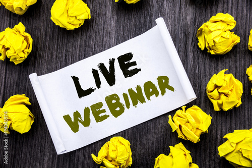 Writing text showing Live Webinar. Business concept for Business Web E-learning Written on sticky note notepad note notebook book wooden background with yellow sticky folded.