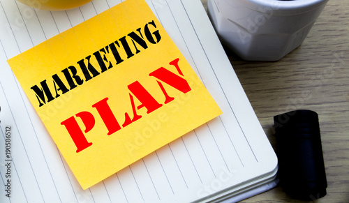Writing text showing Marketing Plan. Business concept for Planning Successful Strategy written sticky note empty paper, Wooden background with copy space, Coffee and marker
