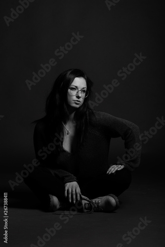 Wunderschönes schwarzhaariges Model in schwarzweiß im Studio mit Brille, Pullover und Stiefel