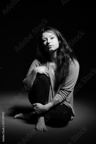 Wunderschönes schwarzhaariges Model in schwarzweiß im Studio mit Brille, Pullover und Stiefel