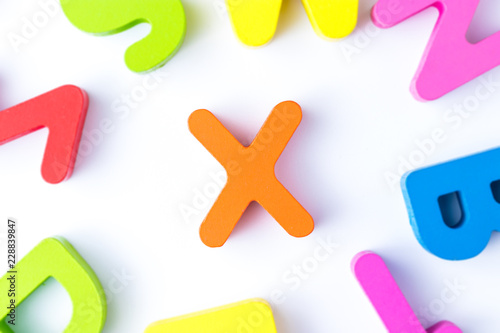 X letters in English made from wood bright colors.