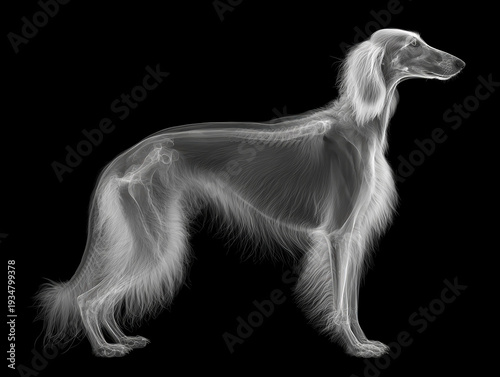 X-ray image of a greyhound, depicted in profile view against black background Every bone structure visible, with artistic manipulation adding depth and intrigue - AI-Generated