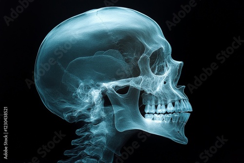 X-ray image of a human skull showcasing detailed bone structure and dental alignment