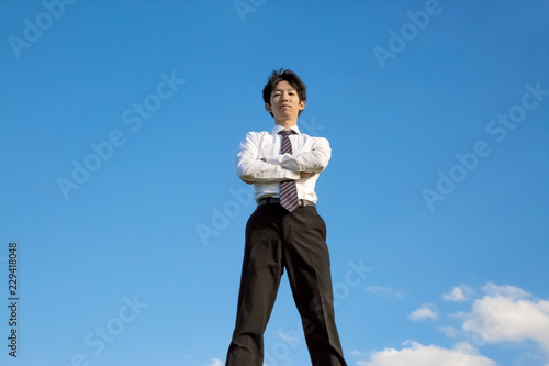 青空をバックに腕組しながらカメラ目線のYシャツ姿の若い男性1人。独立・起業・成功・努力・責任イメージ