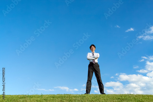 青空をバックに腕組しながらカメラ目線のYシャツ姿の若い男性1人。独立・起業・成功・努力・責任イメージ