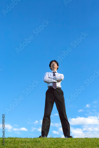 青空をバックに腕組しながら見上げるYシャツ姿の若い男性1人。独立・起業・成功・努力・責任イメージ