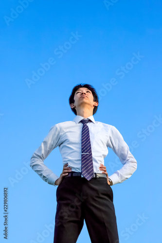 青空をバックに腰に両手を当て見上げる若いYシャツ姿の男性1人立ち姿。ビジネス、成功、野心、向上心イメージ