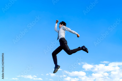 青空をバックにジャンプするYシャツ姿の若いビジネスマン1人。元気・パワー・喜び・挑戦イメージ