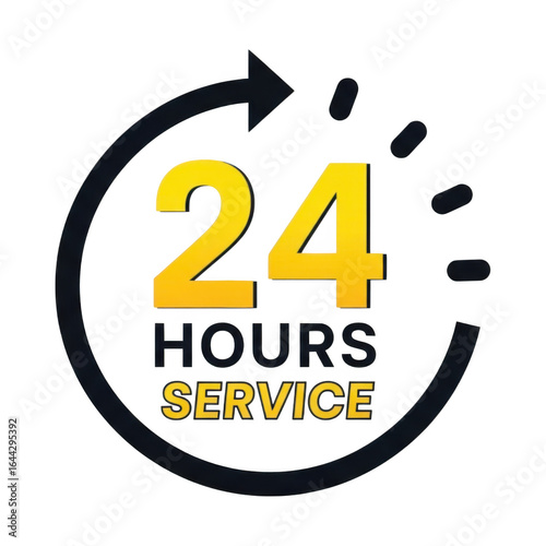 Yellow 24 hours service text with circular arrow icon isolated on transparent background