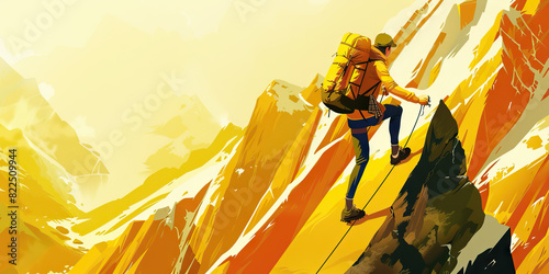 Yellow: An adventurous explorer climbs a towering mountain, their gaze fixed on the breathtaking view from the summit