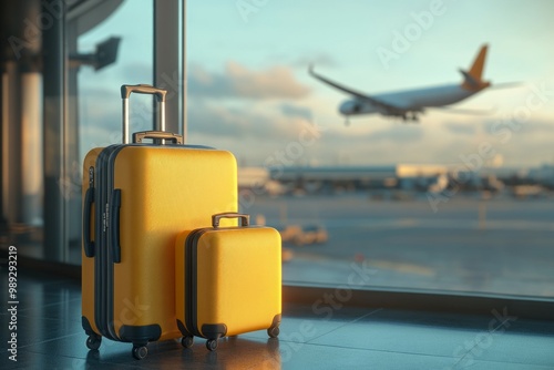 yellow and grey luggage with a suitcase next to a window at an airport, with an airplane flying in the background.