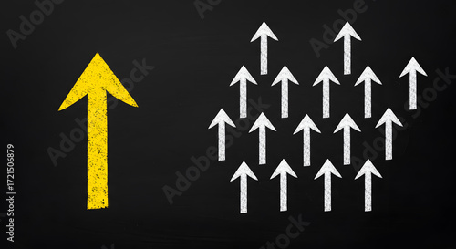 Yellow arrow coming out from the advancing white arrows on chalkboard, different business concept