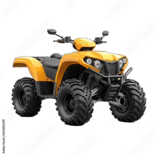 Yellow ATV with rugged tires, headlights, and handlebars isolated on transparent background.