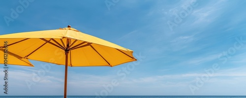 Yellow beach umbrella against a clear blue sky, perfect for summer relaxation and outdoor activities.