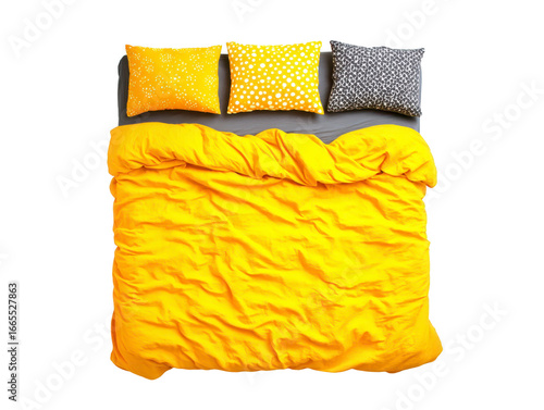 Yellow bedding three decorative pillows polka dot pattern cozy bedroom modern home decor comfortable inviting cheerful top view relaxation