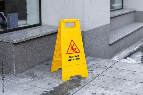 Yellow caution wet floor sign on sidewalk near building entrance. Safety warning sign outdoors. Slippery surface alert after cleaning or ice melting. Urban public area hazard prevention concept.