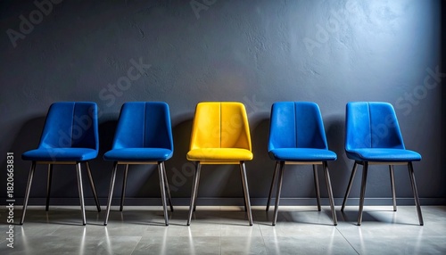 Yellow chair among blue chairs against dark wall, symbolizing individuality and visual contrast.