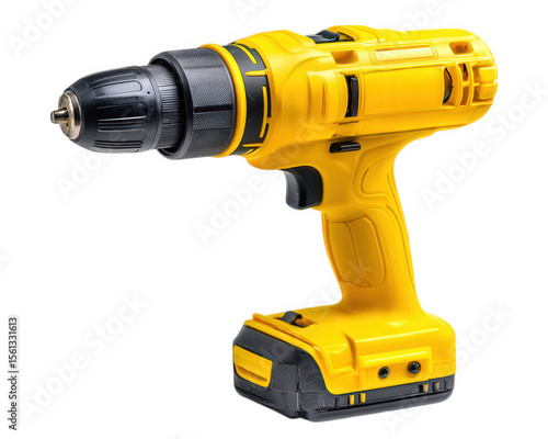 Yellow cordless electric drill power tool isolated on transparency background construction equipment plastic and metal handheld modern design professional use home improvement
