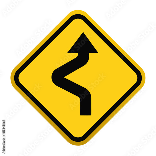 Yellow curvy road ahead warning sign with black border