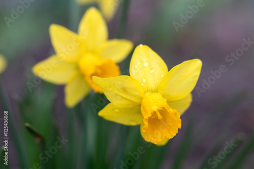 yellow daffodils in the garden close-up on a blurred background