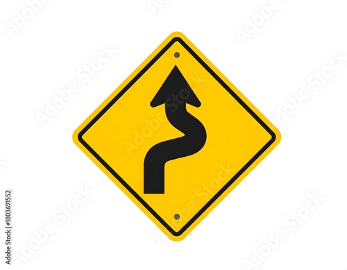 Yellow diamond sign with black arrow indicating a winding road ahead