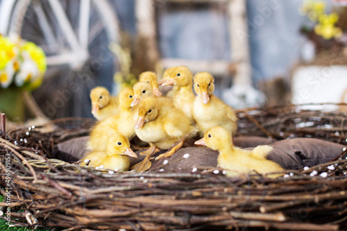 Yellow ducklings in a wooden basket