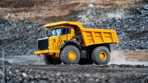 yellow dump truck moves through a rugged mining area, showcasing its powerful wheels and robust design. Dust rises as it transports materials, highlighting its role in extraction activities