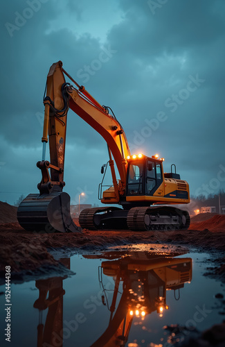 Yellow excavator machine at construction site. Big heavy industrial machinery for earthmoving work at dusk. Digger digging ground. Commercial construction, civil engineering works. Road construction