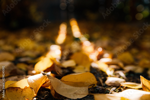 Yellow fallen leaves lie on the ground in autumn
