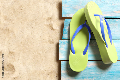 Yellow flip flop on blue wooden boards on the sand beach