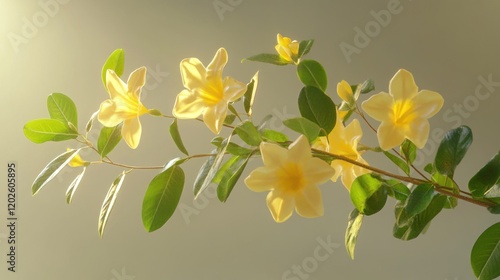 Yellow flowers, sunlit branch, studio backdrop, spring floral design