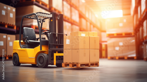 Yellow forklift loader pallet stacker truck equipment at warehouse. Ai generated