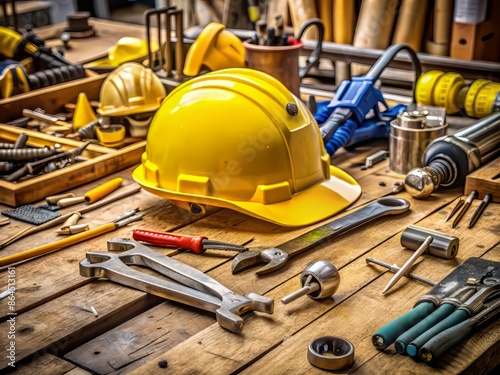Yellow hard hat and various tools, including wrenches, pliers, and a level, are scattered on a workbench in a cluttered workshop or construction site.