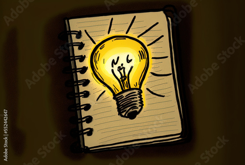 Yellow idealight bulb drawn in the top perspective on a black notebook with yellow marker. Generative AI