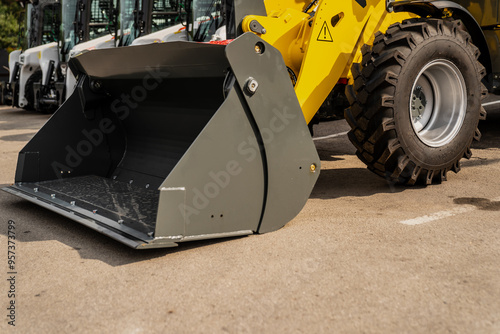 Yellow industrial wheel loader front part with bucket. Loader rocker lift part and tripper cylinder system