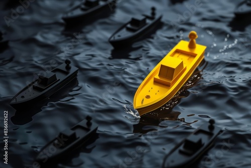Yellow leader boat guiding black boats on a dark background, showcasing leadership with empty space for text on the left 3D illustration