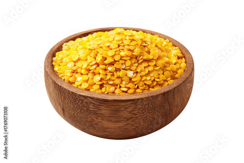 Yellow lentils in wooden bowl. Isolated on black backdrop