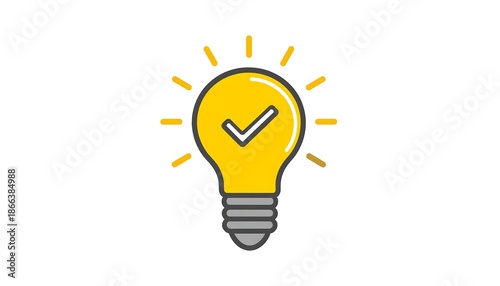 Yellow lightbulb with tick, radiating lines. Positive idea, confirmation